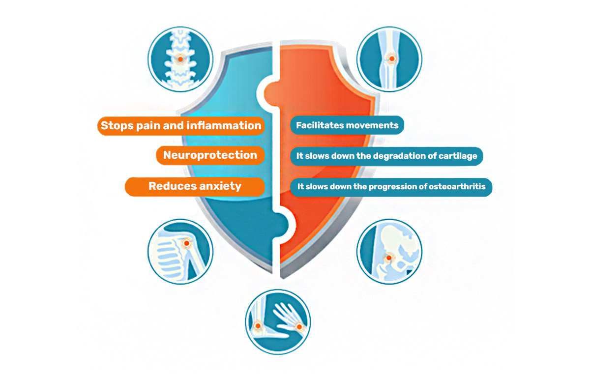Clinical studies have confirmed that PEA has anti-inflammatory, analgesic and neuroprotective effects. In addition, PEA has a positive effect on the removal of damaged tissue and healing, thus contributing to the preservation of joint structure and function.