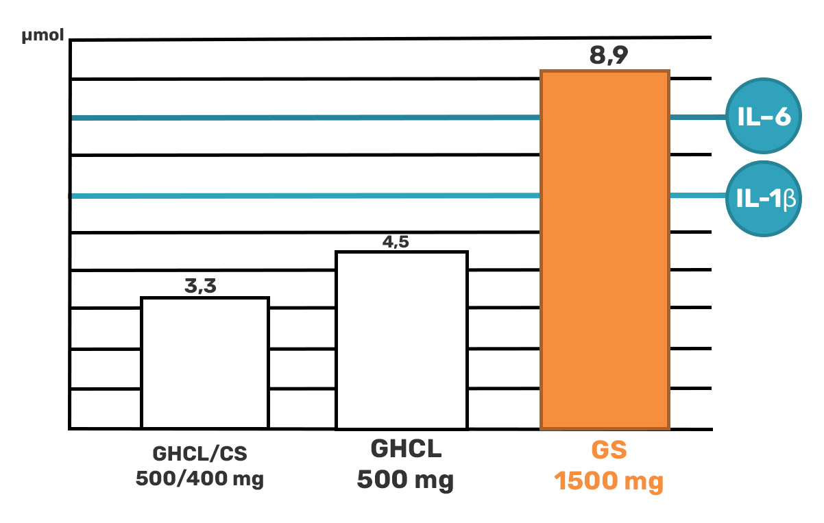 Only GS in a single dose of 1500 mg in the synovial fluid achieves the necessary mean inhibitory concentration (greater than 6.2 µmol), for the complete blockade of IL 1β and IL-6.