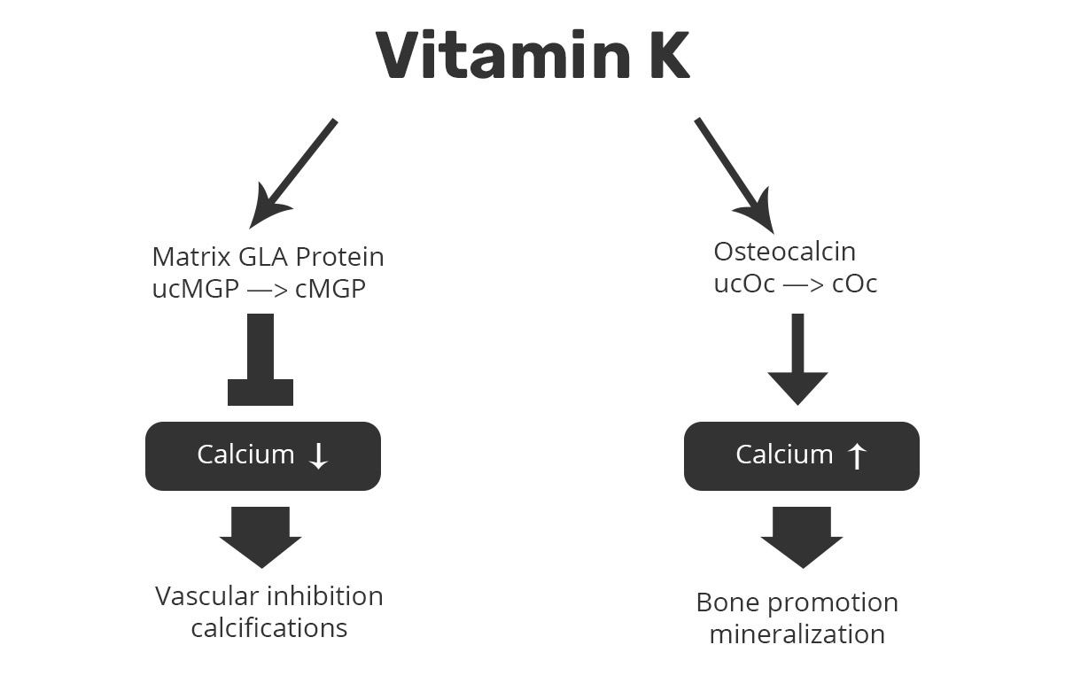 Vitamin K2 is an essential cofactor for the activation of the enzyme Y-carboxylase, thus participating in the carboxylation and activation of vitamin K-dependent proteins in bones (osteocalcin) and smooth muscles of the arterial wall (matrix GLA protein). Thus, vitamin K2 reduces the risk of osteoporosis and consequent fractures, as well as vascular calcificationscalcifications.